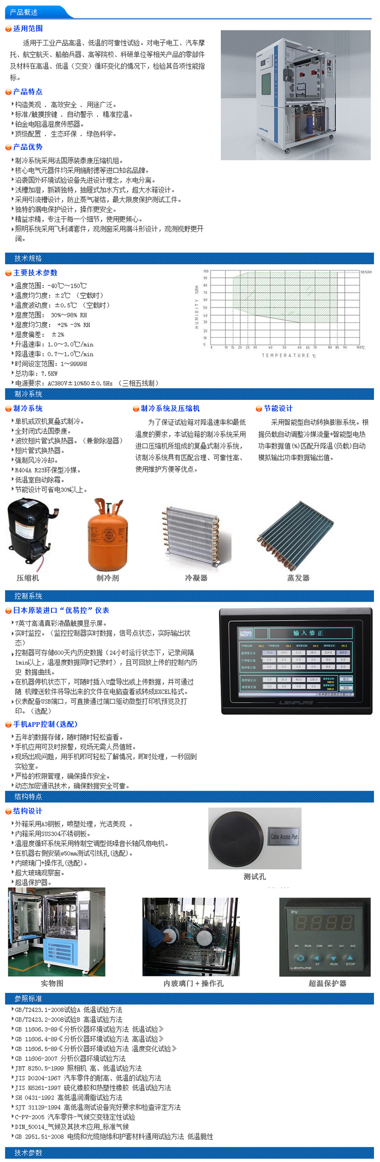 本類試驗(yàn)箱符合國(guó)家標(biāo)準(zhǔn)GB10589《低溫試驗(yàn)箱技術(shù)條件》和GB11158《高溫試驗(yàn)箱技術(shù)條件》,具體設(shè)備參數(shù)以技術(shù)協(xié)議為準(zhǔn)。極寬的溫度控制范圍,可滿足GB/T2423《電工電子產(chǎn)品基本試驗(yàn)規(guī)程》1、2、3、4項(xiàng)的試驗(yàn)要求。獨(dú)特的平恒調(diào)溫控制,可進(jìn)行高精度,高穩(wěn)定的溫度控制。嵌入式計(jì)算機(jī)系統(tǒng),可選配485通訊接口,便于遠(yuǎn)距離控制和中央集中控制。可記錄90天的試驗(yàn)數(shù)據(jù)(相當(dāng)于配備無(wú)紙記錄儀)。